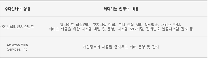 | 위탁업무 내용 | CRM 서비스 제공 업체로 이용자의 개인정보 보관 및 데이터 처리 |